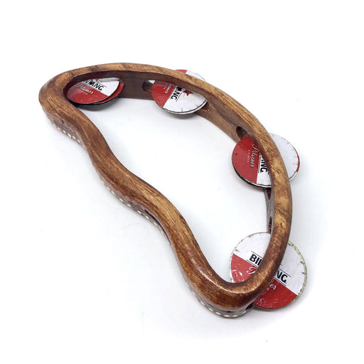 Drum Supplyアルフムーンの形。非常に美しい、乾いたハンマーで打たれたアフリカのボトルキャップのジングルが付いた小さな木製のハンドタンバリン。軽量で心地よい感触。 本物のアフリカのボトルキャップが、この魅力的で持ちやすい木製タンバリンに、乾いた「ジングル」と地元の活気を与えています。演奏するたびに、バ...