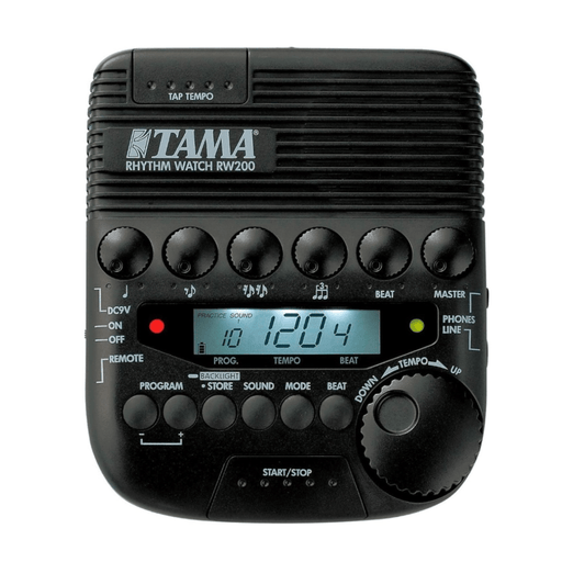 リズムウォッチ RW200。TAMA のリズムウォッチには、ライブでもスタジオでもテンポを保つためにドラマーが必要とするすべての機能が備わっています。オリジナルのリズムウォッチと同様に、RW200 は、実際のドラム演奏に十分な音量、テンポをすばやく調整できるダイヤル、4 分音符...