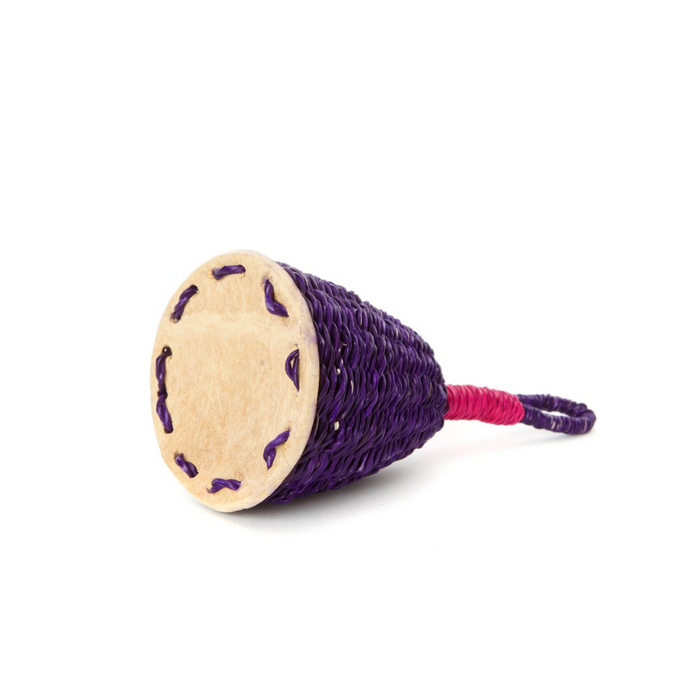 ガーナのボルガタンガ地方の職人が、鮮やかな色に染めた硬い象の草から、このカラフルなアフリカの打楽器を手作りしています。ひょうたんの土台が、ガラガラと鳴る豆をそのままにしています。