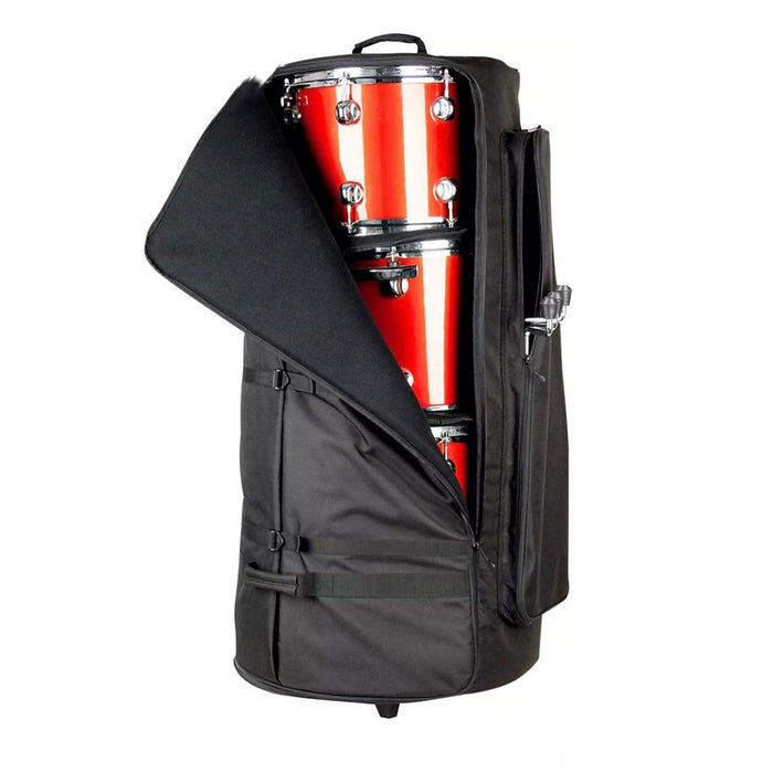 もう一つの素晴らしいソリューションです。Protec は、2 つのタム、フロア タム、その他のアクセサリを収納して持ち運べるユニークなドラム バッグを開発しました。徐々に先細りになるデザインで、下部がわずかに大きく、上部が小さくなっています。ほとんどの 18 インチ タム/キックにフィットし、その上に 2 つの小さなタムを重ねることができます。