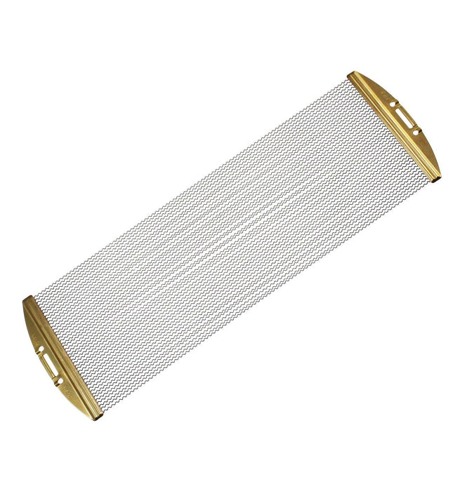 Snare with German heat treated wire for slightly more dry response. The "brassy" phosphor bronze end plates offer great tone and have "cranked" spots for snare cord to move through freely. This avoid choking the head or wire response.