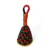 Natural grass and dyes woven together with a calabash gourd bottom sewn on. Stones inside against the grass provide a soft sound, up against the gourd expect a sharp rap. About 7" tall x 3" wide