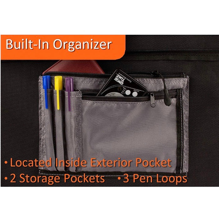 - Large 13 x 17 x 1.25" pocket with built-in organizer along with a smaller gusseted pocket on the front