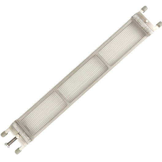 Rogers Dyna-Sonic snare rail system. Provides the drum with floating snares that can be tensioned without applying pressure to the drumhead on drums with no snare beds. Made of cast steel, the frame comes mounted with snare wires. One tension screw at the end of the frame provides uniformed tensioning with a simple hand adjustment. Measures 14.5" from end to end and comes with 20 strand wires. Includes nylon mounting cords.