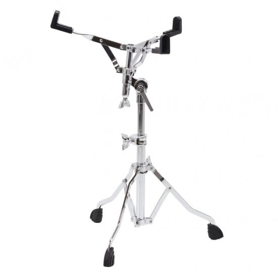 The Rogers Dyno-Matic lightweight snare stand has a single-braced tripod base with Rogers swan leg design for its low center of gravity. It has a locking snare basket with a gearless lever action tilter. A 360 degree height adjuster with all direction access allows for easy adjustments.  Adjustable from 19" to 26". The upper tube is 5/8" in diameter and the lower tube is 7/8" in diameter.