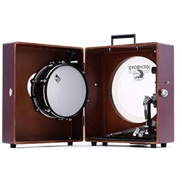 The Kickboxx Suitcase is a drum set with a Kick, Snare and Tom, plus room for your favorite kick pedal. The Kickbox acts as a carrying case for the entire set. Packed up, it’s small enough to fit in most airline overhead compartments. It features a 14” Bass Drumhead, 10” snare (with throw-off), 10” tom, and retractable accessory posts.