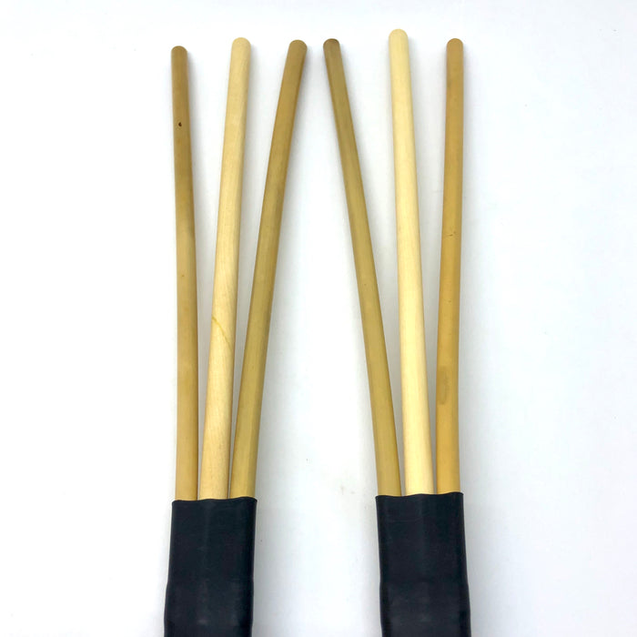 Stackable Vic Firth RE-MIX brushes allow you to mix colors and textures around the kit like never before. Each design in the RE-MIX series is a collaboration between world percussionist Pete Lockett (Björk, Peter Gabriel) and Vic Firth, designed to allow trap setters to train beaters to explore new sounds from traditional instruments. The RE-MIX RM4s are made from large-bore sandwiched dowels of artisan rattan and birch. The two woods converge on cymbals and skins to create an utterly unique response — sort of like traditional rute sticks, but more open, and easier for rakes and swirls.